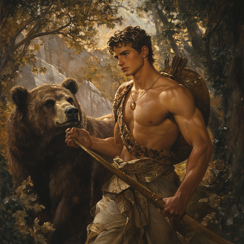 Arcas, est une figure relativement discrète mais essentielle du panthéon grec. Il incarne à lui seul cette tension fondatrice entre nature et culture, entre monde sauvage et civilisation naissante — tension que l’Arcadie tout entière semble cristalliser. Fils de Zeus, le maître de l’Olympe, et de Callisto, une nymphe de la suite d’Artémis, Arcas naît d’une union qui, comme souvent dans les mythes grecs, mêle la séduction divine au drame terrestre. Callisto, séduite ou violée par Zeus, est ensuite transformée en ourse par Héra, jalouse, ou selon une autre tradition, par Artémis elle-même, furieuse de voir l’une de ses suivantes rompre le vœu de virginité. C’est ainsi que la mère d’Arcas devient, malgré elle, une créature intermédiaire, à mi-chemin entre la femme et l’animal, dans une métamorphose qui symbolise la précarité de la condition humaine face aux puissances divines. Selon les versions les plus courantes du mythe — notamment rapportées par Apollodore (Bibliothèque, III, 8, 2) et Ovide (Métamorphoses, II, 401-530) — Arcas est confié à la protection du dieu Hermès, confié à sa mère la Pléiade Maïa, puis élevé par un couple d’Arcadiens. Mais l’essentiel de son destin réside dans le moment dramatique où, devenu adulte, Arcas, chasseur comme tous les hommes de sa terre, se trouve face à une ourse qu’il s’apprête à tuer — sans savoir qu’il s’agit de sa propre mère. Zeus intervient à temps, les sauve tous deux de la tragédie, et les transforme en constellations : Callisto devient la Grande Ourse, et Arcas, le Bouvier ou parfois la Petite Ourse selon les variantes. Ce geste cosmique marque une élévation paradoxale : ce qui aurait pu être un matricide est suspendu, sublimé dans le ciel étoilé, comme si le ciel lui-même devenait l’ultime sanctuaire des liens familiaux menacés par l’oubli.